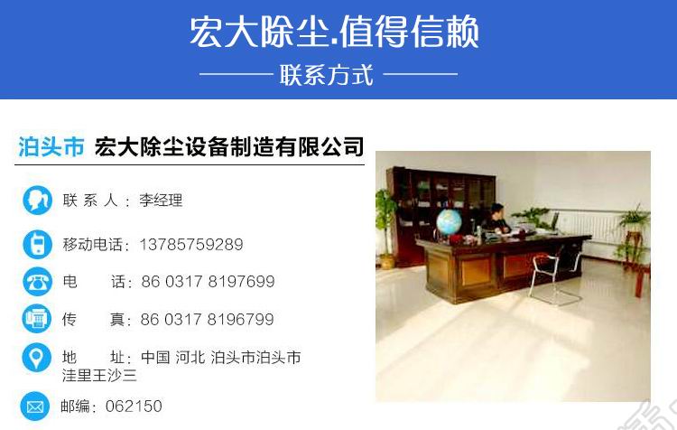 公司名稱:泊頭市宏大除塵設(shè)備制造有限公司 公司地址:泊頭市開發(fā)區(qū)環(huán)城東路南首1號 電話:0317-8392799 8162866 傳真:0317-8392977 手機(jī):18931764475 網(wǎng)址: